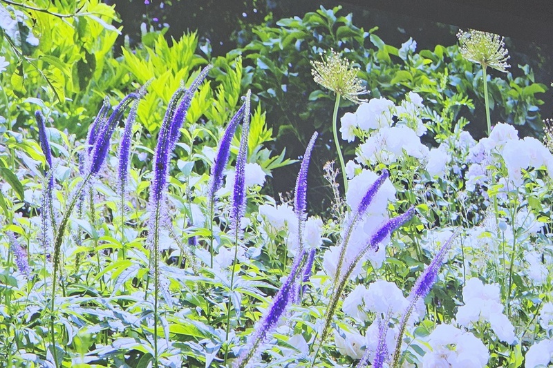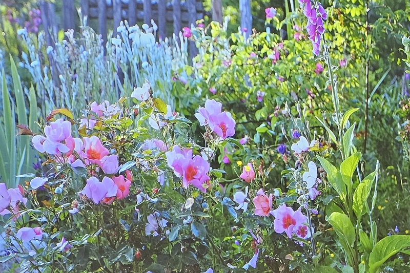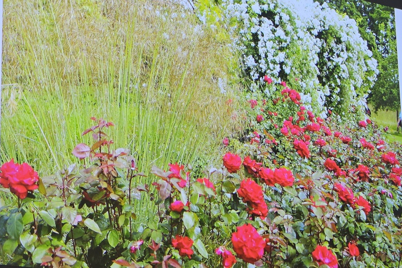 Mit zahlreichen Fotos machte Frau Steffen deutlich, wie vielfältig Rosen und Stauden kombiniert werden können. Zuerst zeigte sie großartige Bilder aus berühmten englischen Gärten, in denen klassische Kombinationen von Rosen mit beispielsweise Steppensalbei, Geranien, Perückensträuchern, Frauenmantel oder Katzenminze zauberhafte farbenfrohe Beete bilden. Aber auch monochrome Gartenräume sind beliebt, wie im “Sissinghurst Castle Garden”, in dem der weiße oder der purpurne Garten die Besucher begeistern.